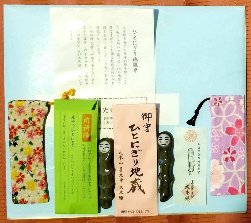 ひとにぎり地蔵 *Tue* 0900 年の瀬も押し迫った頃、善光寺大本願から「ひとにぎり地蔵」がやって来ました。 11月に善光寺へ行ったときちょっと気になっていた、手のひらサイズのお守りお地蔵さんです。. 善光寺大本願香炉の灰が練りこまれた、陶製のお守りです。 数珠を持つ左手で握り締めた形になっており、 不安な時、気持ちが落ち着かないときに 左手で握り締め、幸せや目的成就を願います。 手書きのお顔が可愛いですね 全て微妙に違うお顔は、袋に入っているのでお顔で選ぶことはでき. ⑥ひとにぎり地蔵のお守り 善光寺 お越しの折の参考にしてくださいね^^ 観光地として 長野といえば善光寺と 沢山の方が来ています。 パワーがみなぎる場所なのだと思います。 コロナ終息の折には 是非 お越しください。.