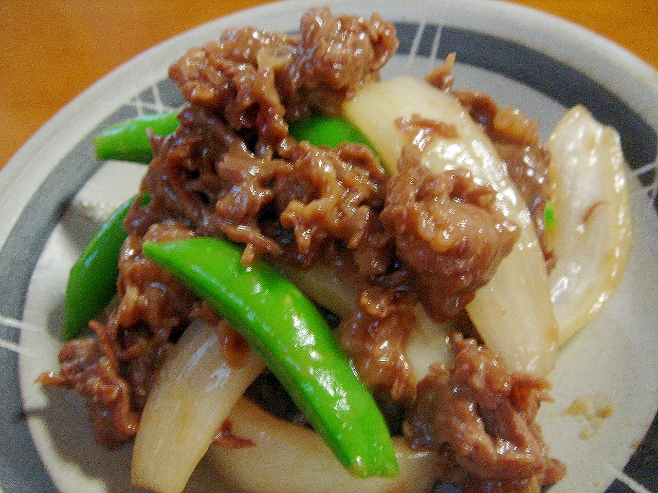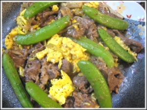 スナップエンドウと牛肉のハチミツ炒め
